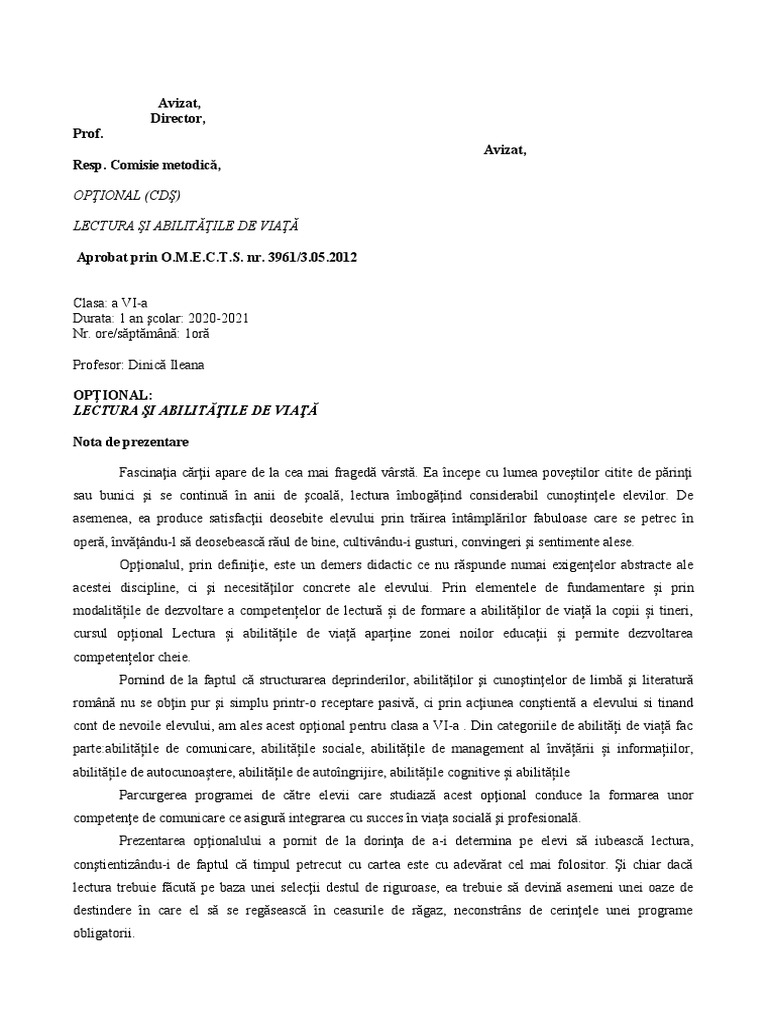 cursul opțional Lectura și abilitățile de viață aparține zonei noilor educații și permite dezvoltarea