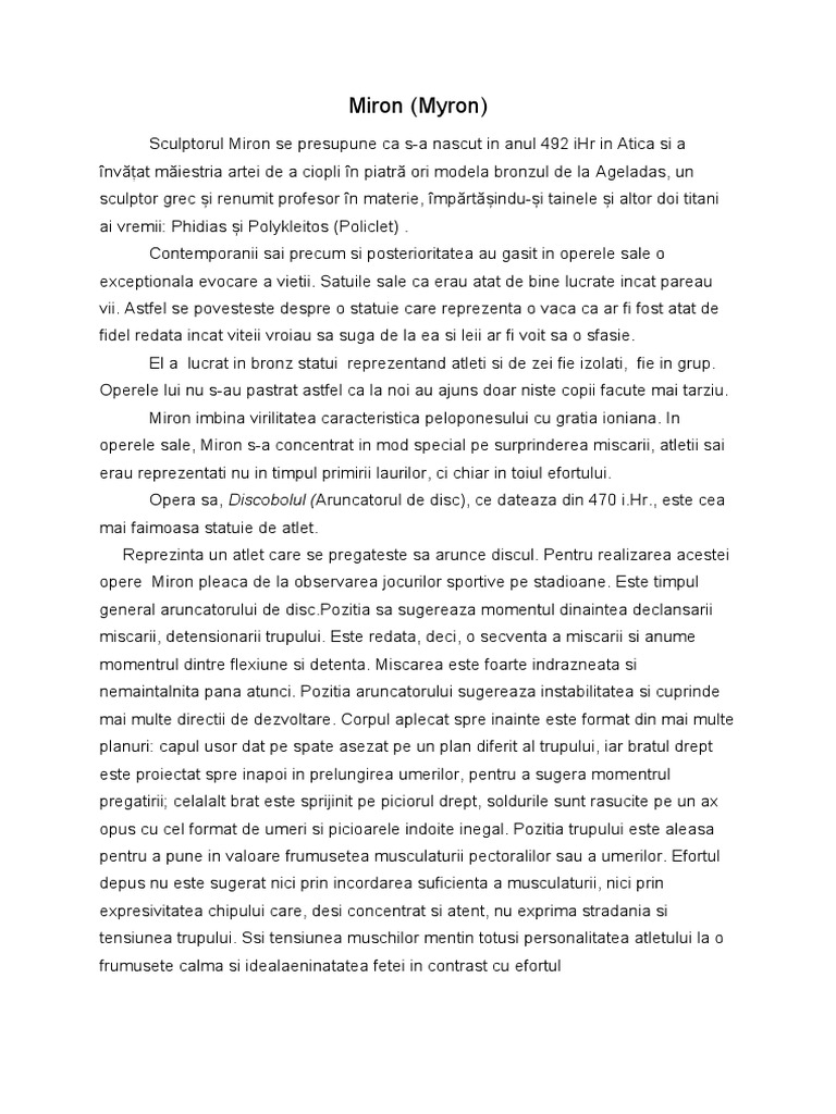 Sculptorul Miron se presupune ca s-a nascut in anul 492 iHr in Atica si a