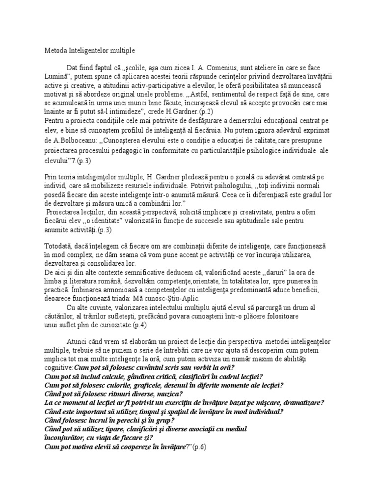 concluzionăm faptul că, “prin explorarea inteligenţelor multiple, putem dezvolta elevilor
