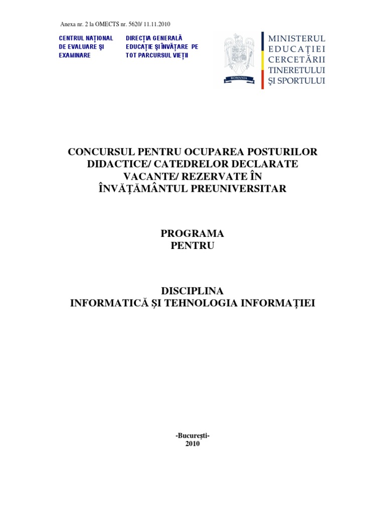 Tematica ştiinŃifică pentru disciplina de concurs Informatică şi Tehnologia InformaŃiei