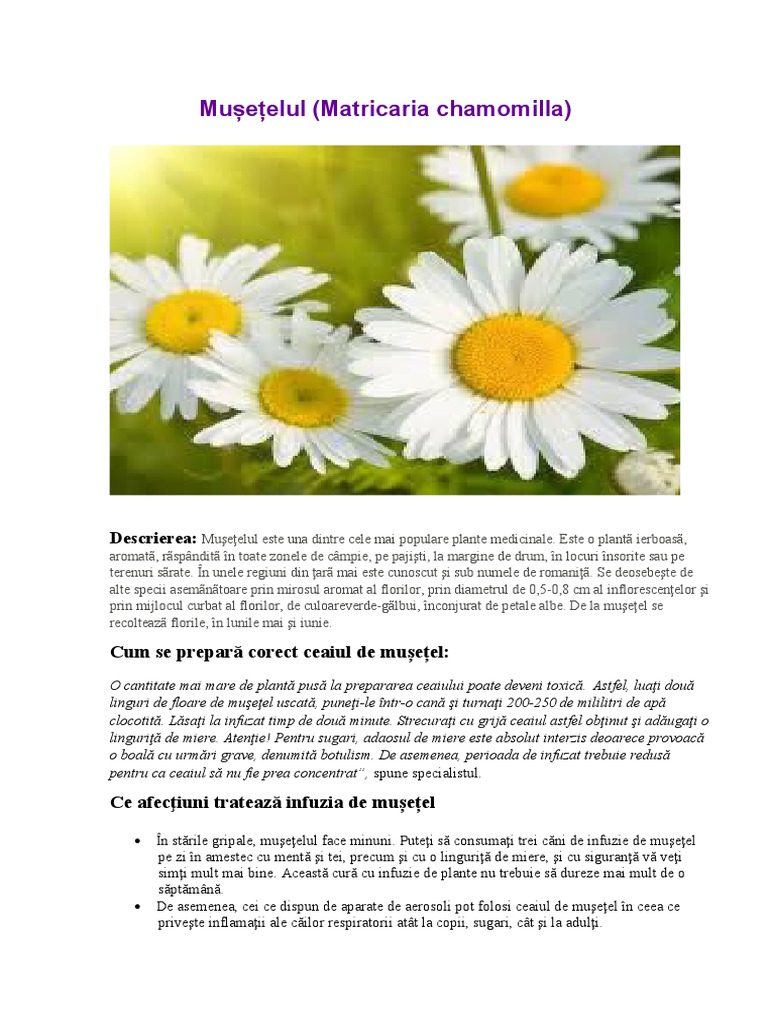 Descrierea: Muşeţelul este una dintre cele mai populare plante medicinale. Este o plantã ierboasã,