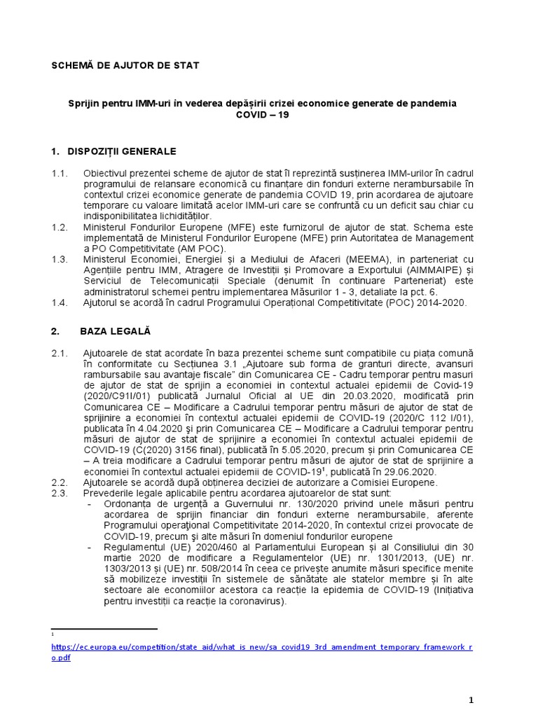 1.1. Obiectivul prezentei scheme de ajutor de stat îl reprezintă susținerea IMM-urilor în cadrul