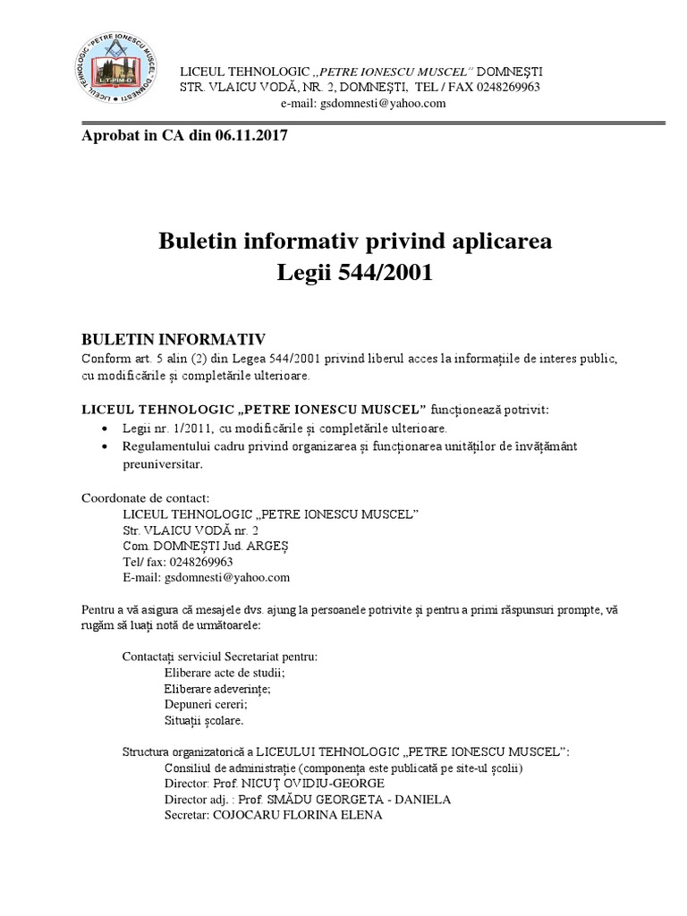LICEUL TEHNOLOGIC „PETRE IONESCU MUSCEL” funcționează potrivit: