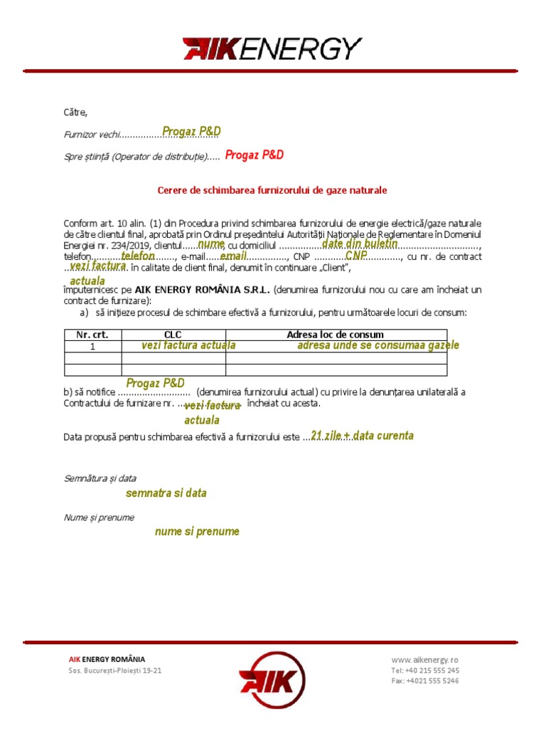 împuternicesc pe AIK ENERGY ROMÂNIA S.R.L. (denumirea furnizorului nou cu care am încheiat un
