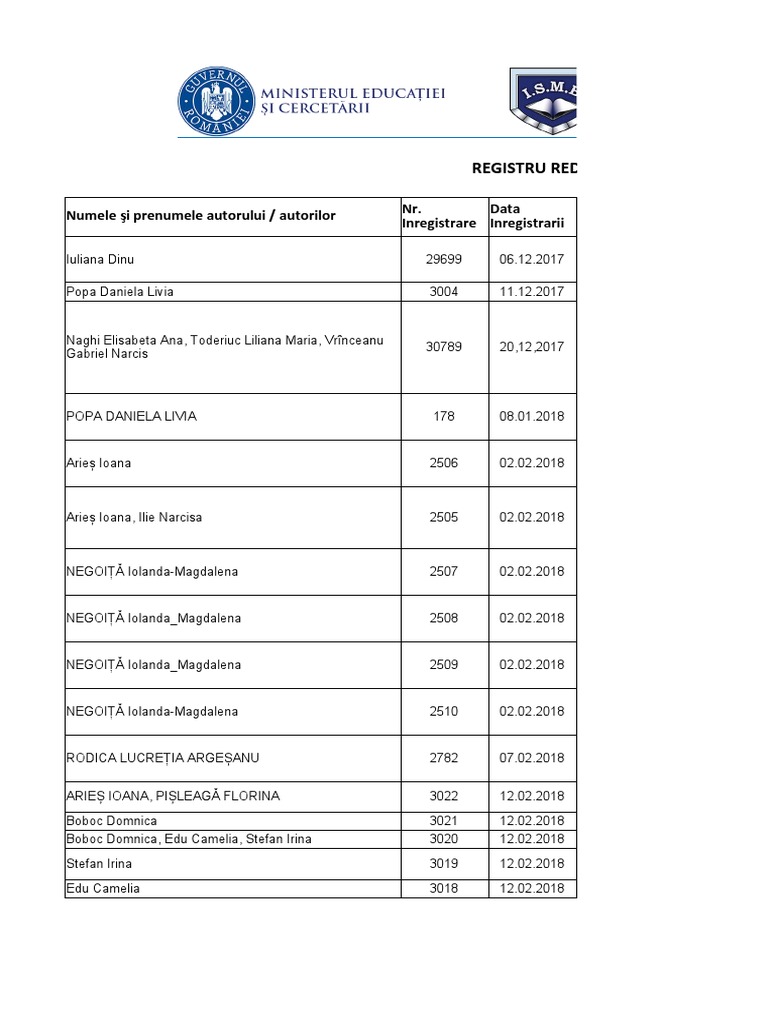 Numele şi prenumele autorului / autorilor Nr. Data