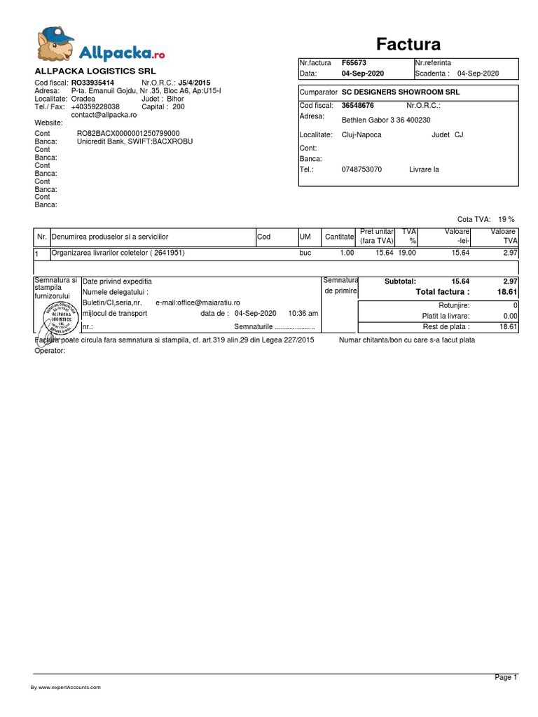1 Organizarea livrarilor coletelor ( 2641951) buc 1.00 15.64 19.00 15.64 2.97