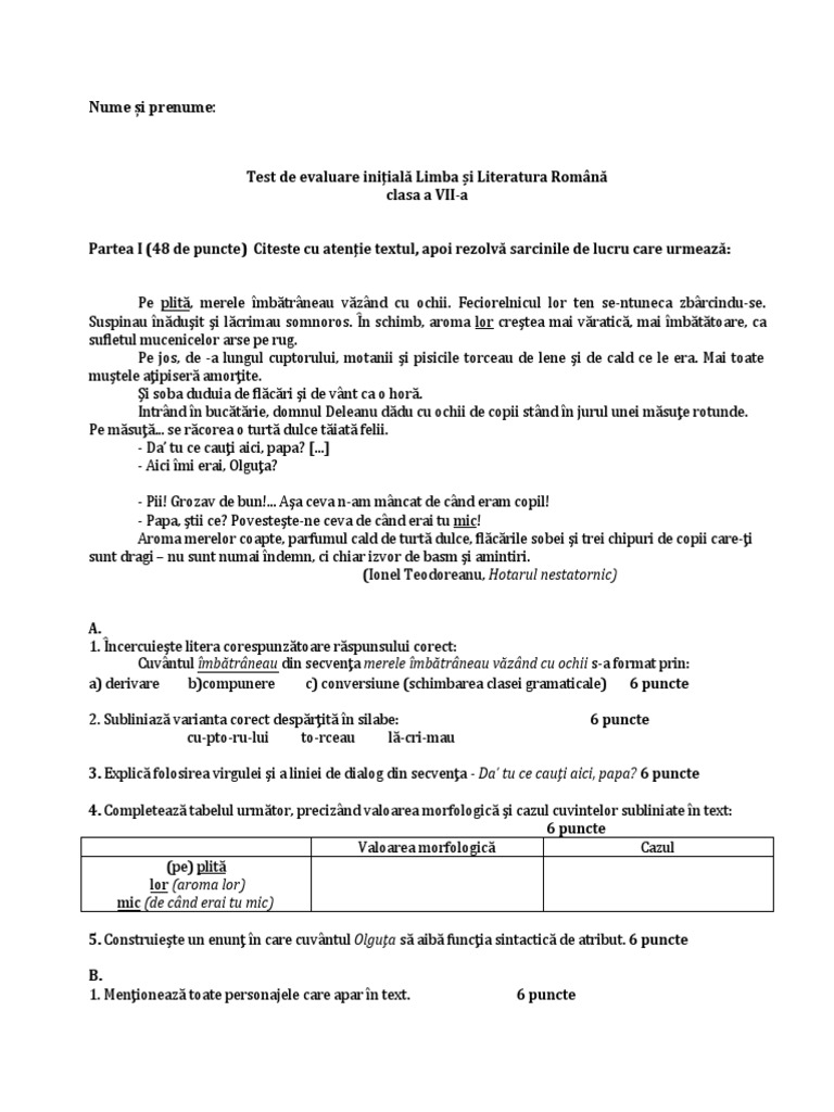 Partea I (48 de puncte) Citeste cu atenţie textul, apoi rezolvă sarcinile de lucru care urmează: