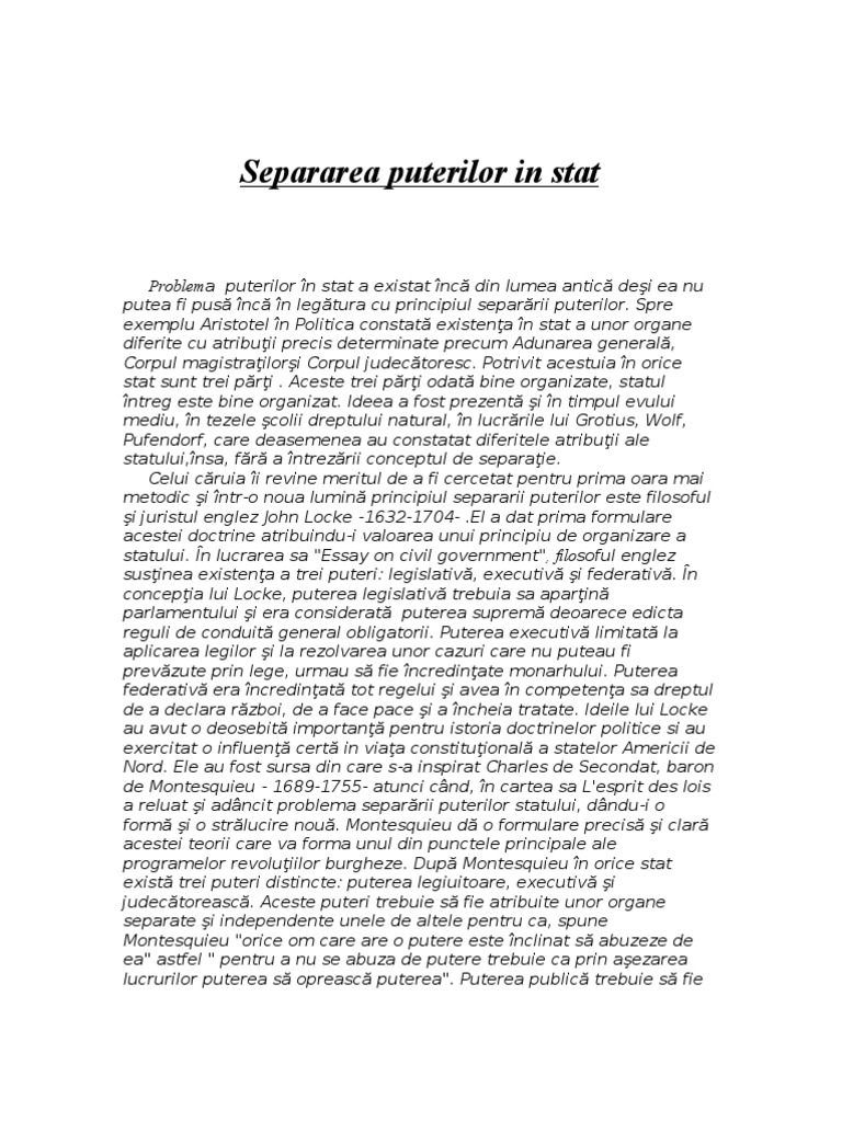 Problema puterilor în stat a existat încă din lumea antică deşi ea nu