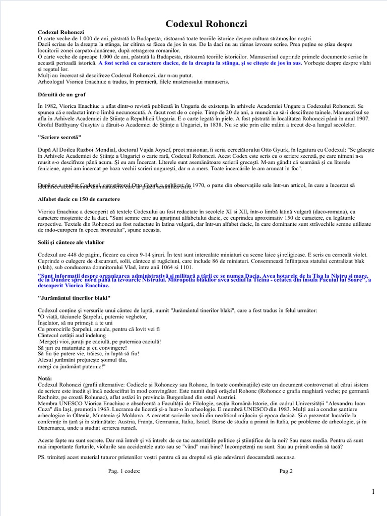 În 1982, Viorica Enachiuc a aflat dintr-o revistă publicată în Ungaria de existenţa în arhivele Academiei Ungare a Codexului Rohonczi. Se