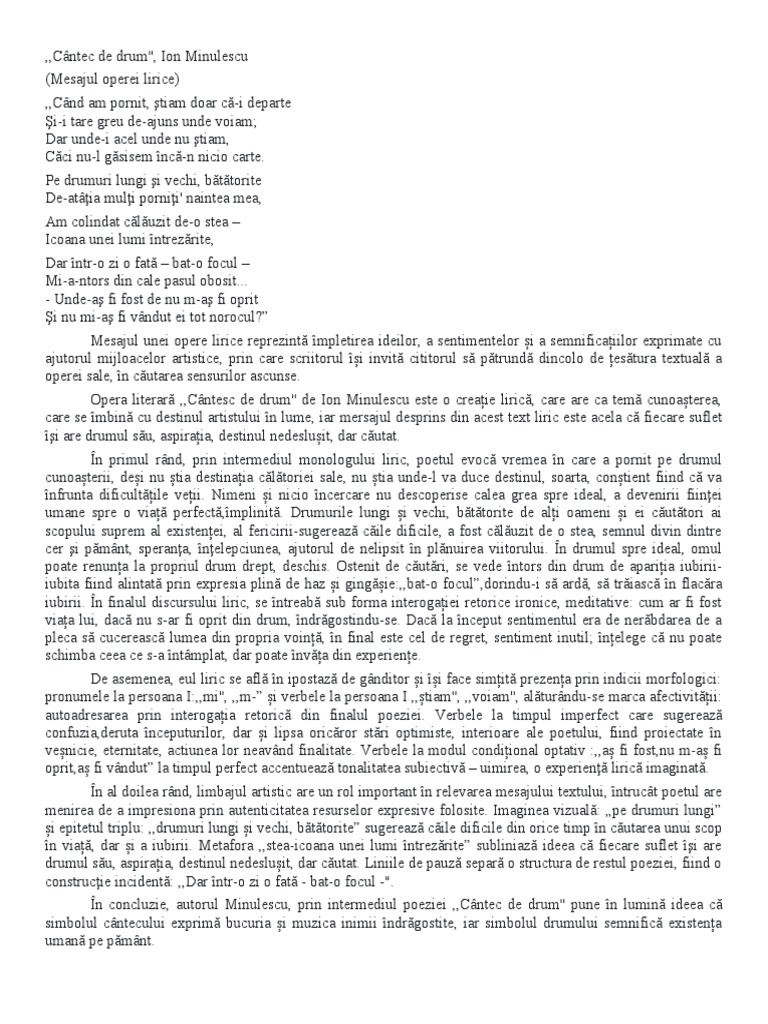 În concluzie, autorul Minulescu, prin intermediul poeziei ,,Cântec de drum'' pune în lumină ideea că