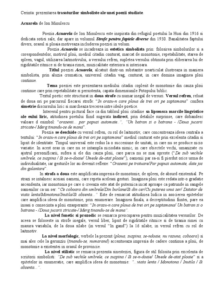 Cerinta: prezentarea trasaturilor simboliste ale unei poezii studiate.