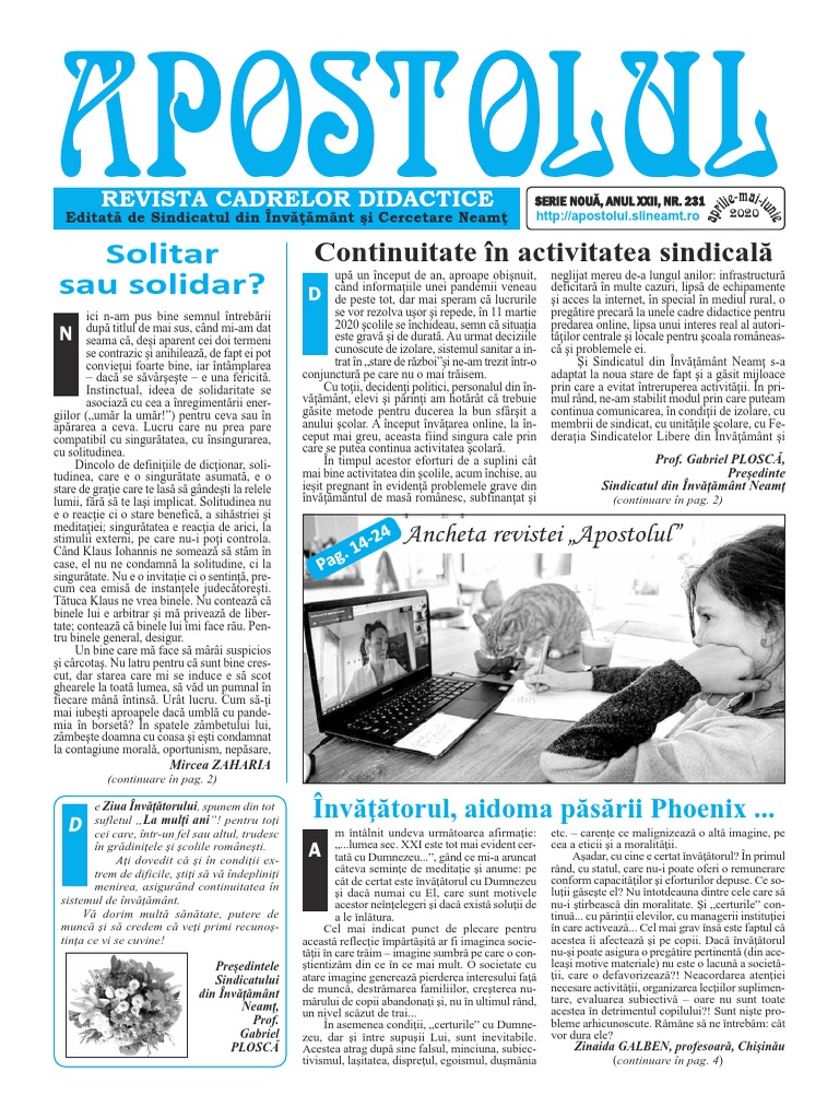 tiparelor şi inerţiilor umane, despre defazajul de totdeauna aşteptată a lecţiilor din mediul online (pag. 18) Continuitate în activitatea sindicală (pag. 1-2)