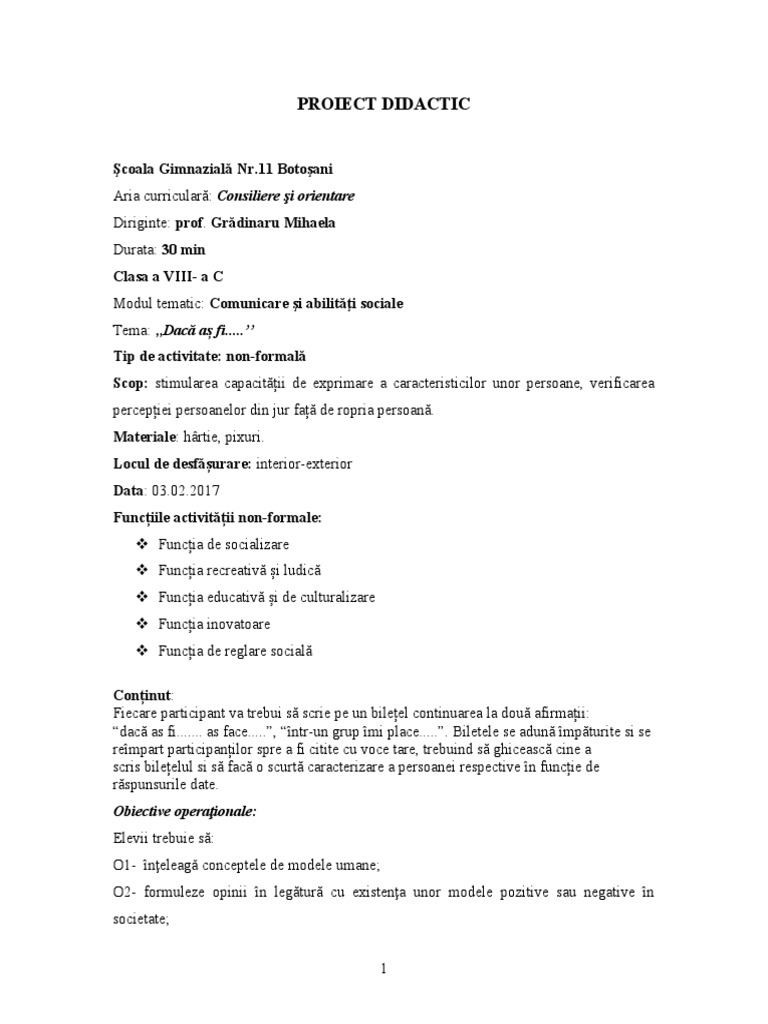 “dacă as fi....... as face.....”, “într-un grup îmi place.....”. Biletele se adună împăturite si se