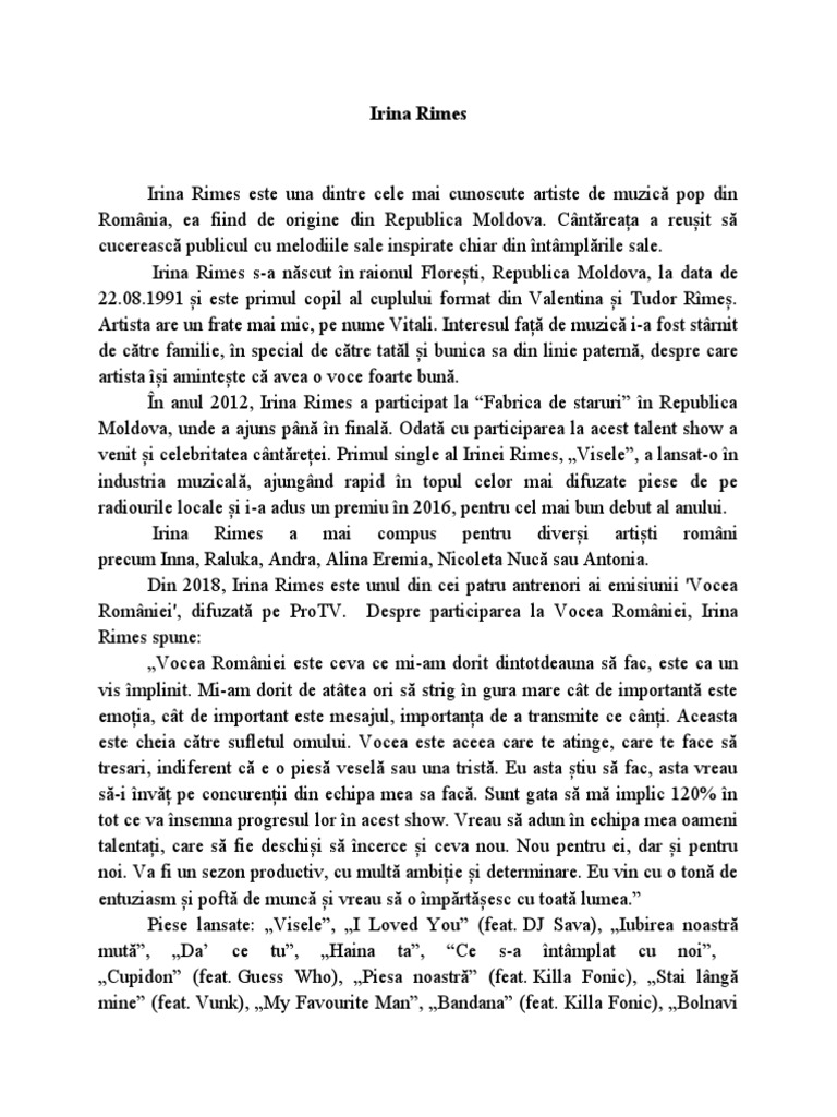 În anul 2012, Irina Rimes a participat la “Fabrica de staruri” în Republica