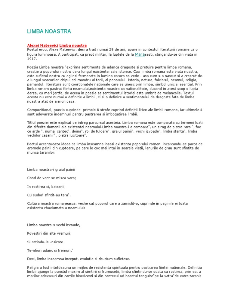 Poezia Limba noastra "exprima sentimente de adanca dragoste si pretuire pentru limba romana,