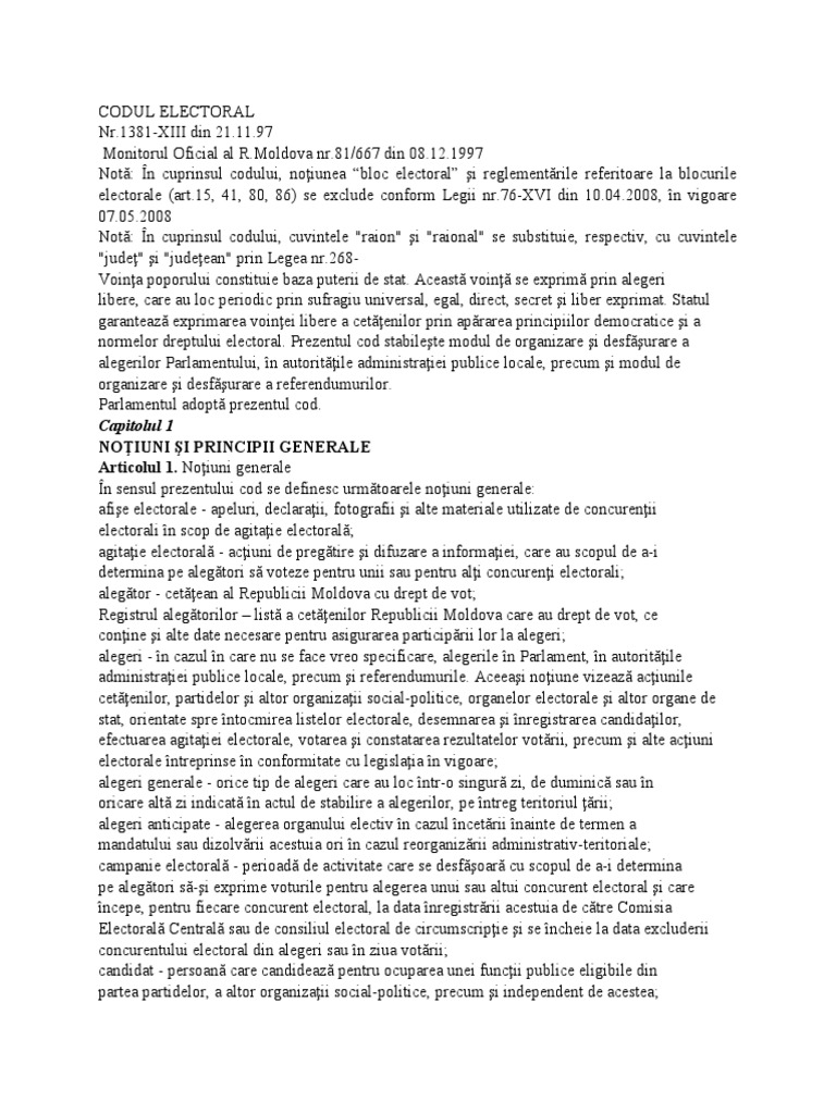 electorale (art.15, 41, 80, 86) se exclude conform Legii nr.76-XVI din 10.04.2008, în vigoare