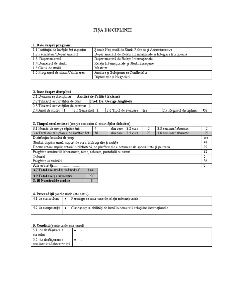 2.1 Denumirea disciplinei Analiză de Politică Externă