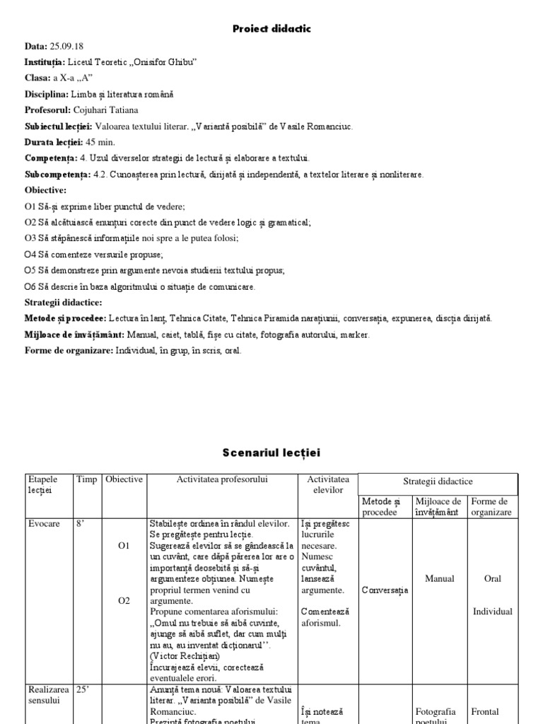 Subiectul lecției: Valoarea textului literar. ,,Variantă posibilă” de Vasile Romanciuc.
