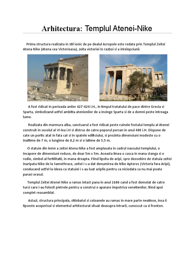 Prima structura realizata in stil ionic de pe dealul Acropole este redata prin Templul Zeitei