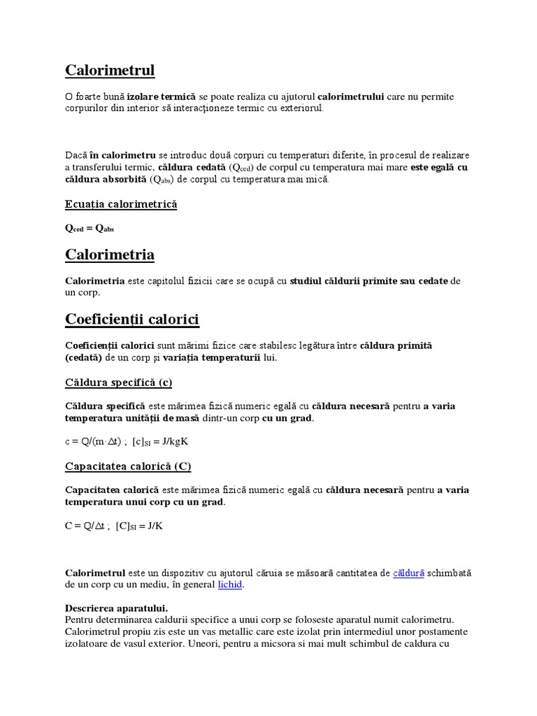 Calorimetria este capitolul fizicii care se ocupă cu studiul căldurii primite sau cedate de