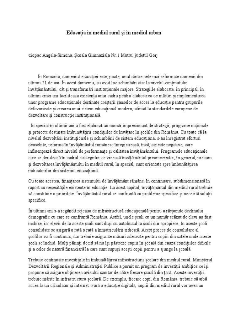 și dezvoltarea învățământului în mediul rural, în special, sunt orientate spre îmbunătățirea