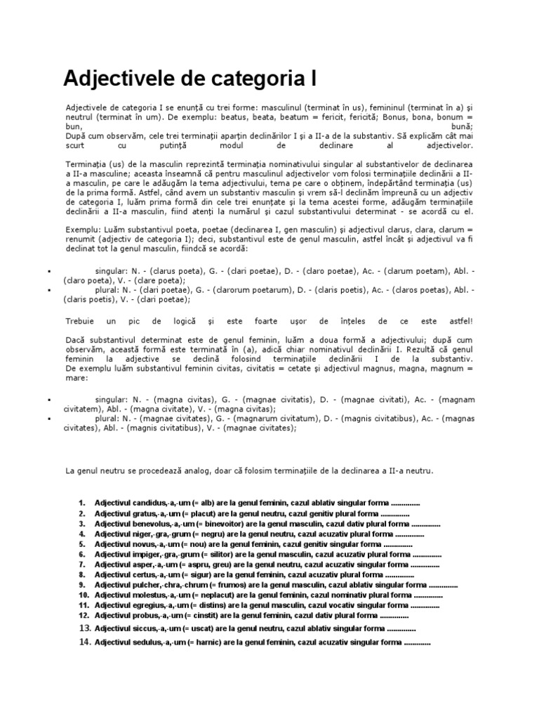 neutrul (terminat în um). De exemplu: beatus, beata, beatum = fericit, fericită; Bonus, bona, bonum =