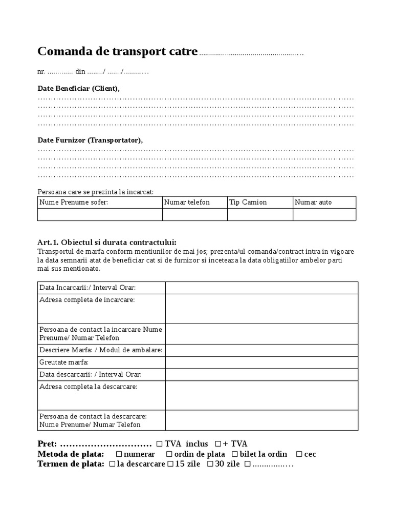 Termen de plata: □ la descarcare □ 15 zile □ 30 zile □ ..............…