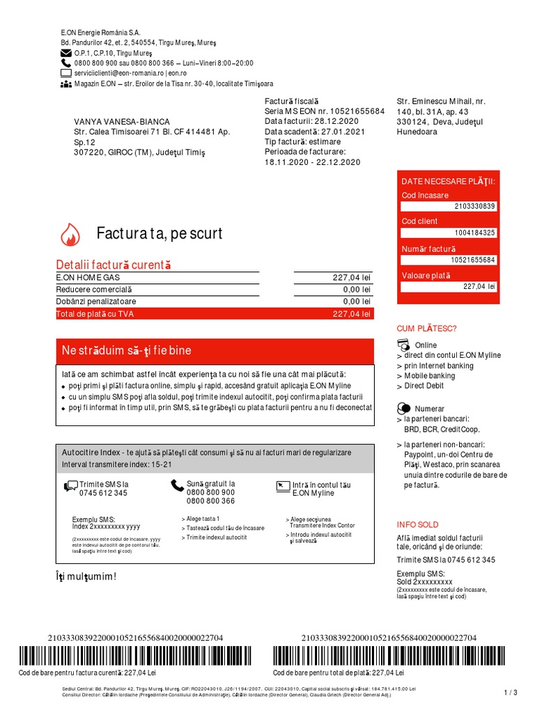 Cod de bare pentru factura curentă: 227,04 Lei Cod de bare pentru total de plată: 227,04 Lei