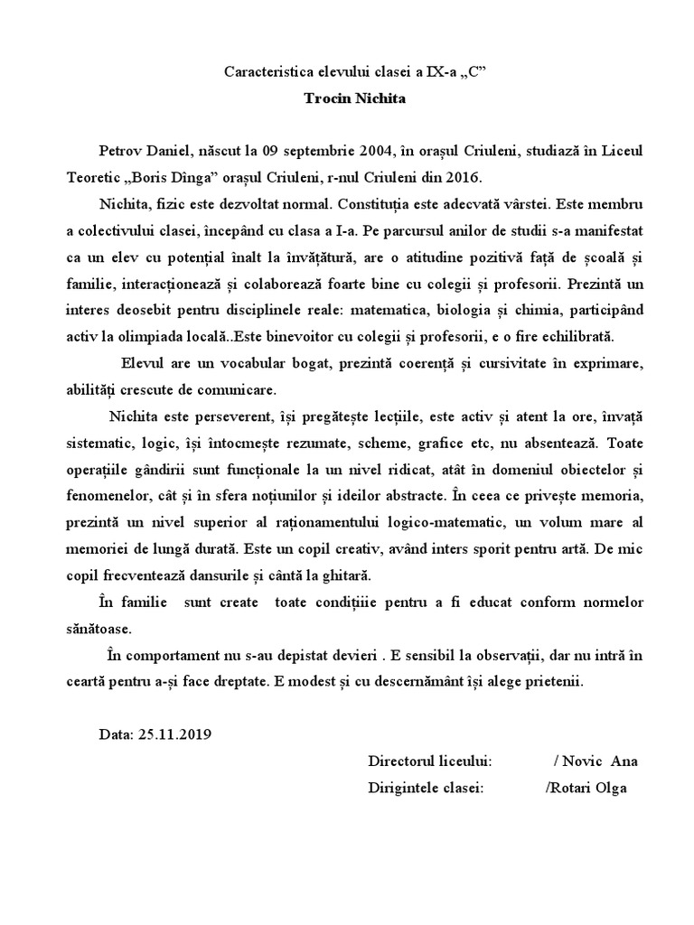 activ la olimpiada locală..Este binevoitor cu colegii și profesorii, e o fire echilibrată.