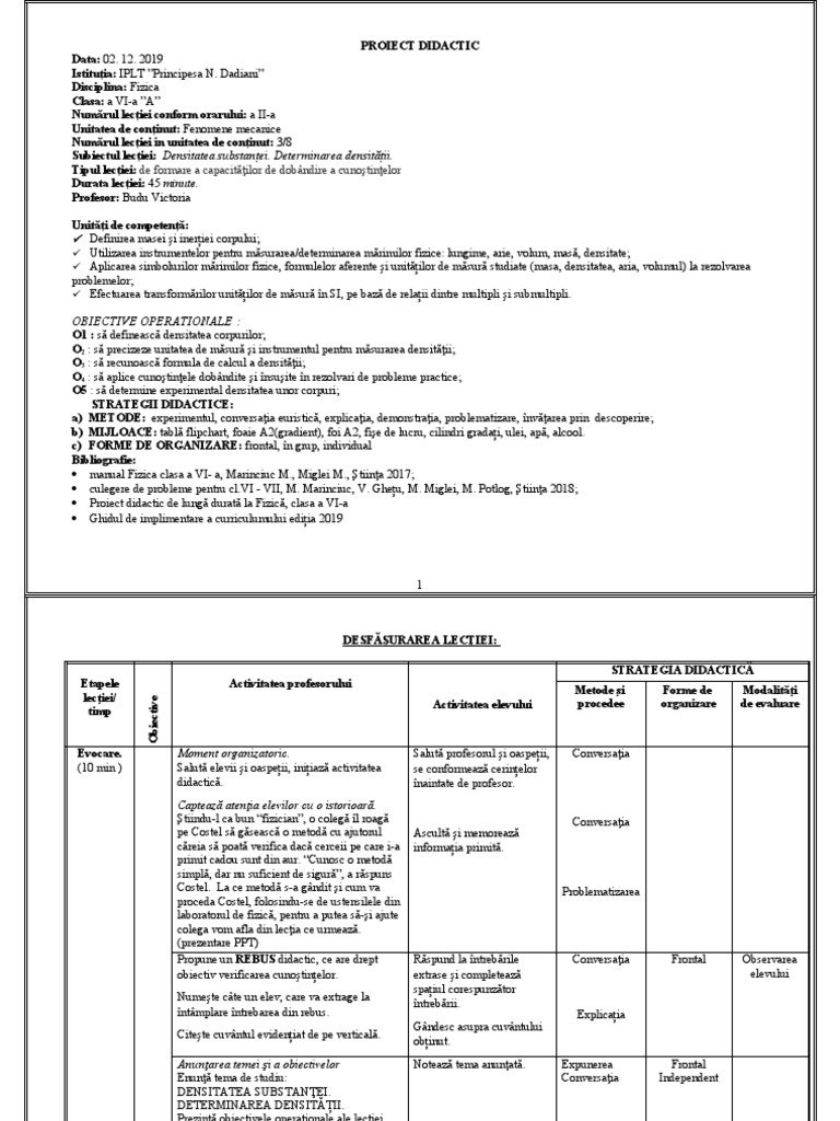 Proiect didactic de lungă durată la Fizică, clasa a VI-a