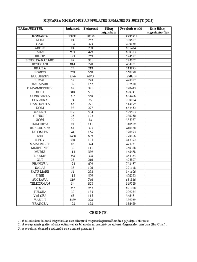 1. să se calculeze bilanțul migratoriu și rata bilanțului migratoriu pentru România și județele aferente;