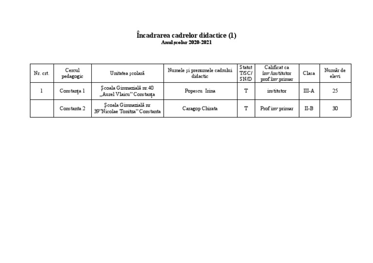 Nr. crt. Unitatea şcolară T/SC/ înv./institutor Clasa