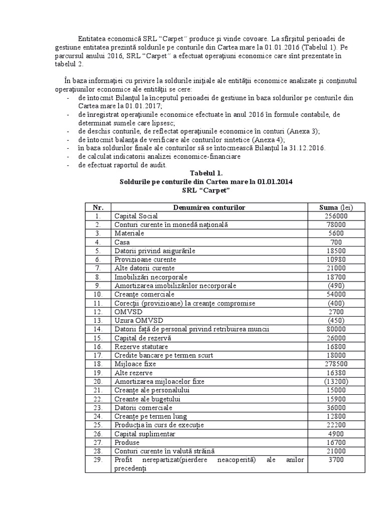 gestiune entitatea prezintă soldurile pe conturile din Cartea mare la 01.01.2016 (Tabelul 1). Pe