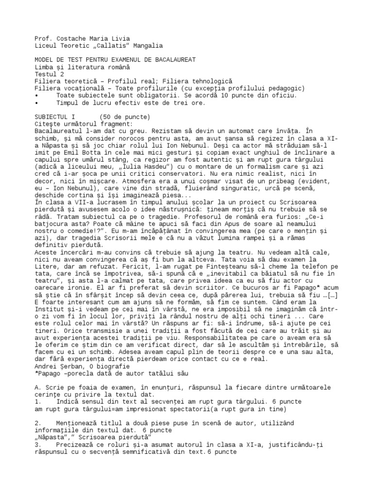 MODEL DE TEST PENTRU EXAMENUL DE BACALAUREAT