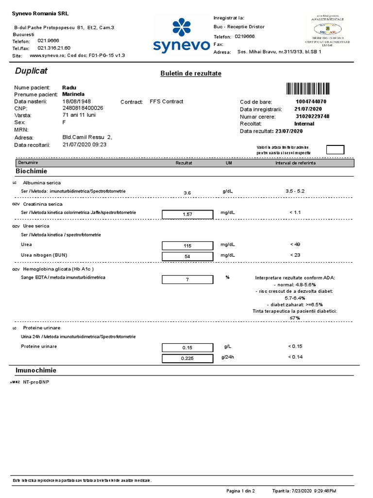 Comentarii: Volumul de urina din 24h declarat de catre pacient este de 1500 ml.