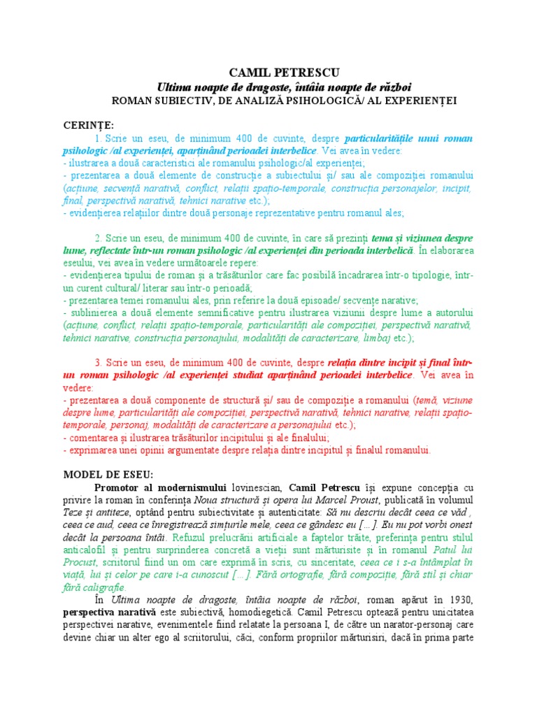 1. Scrie un eseu, de minimum 400 de cuvinte, despre particularitățile unui roman