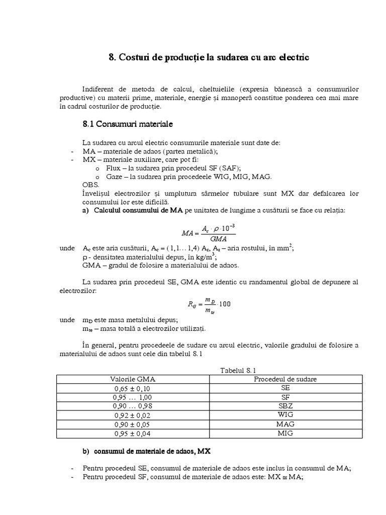 - Pentru procedeul SE, consumul de materiale de adaos este inclus ]n consumul de MA;