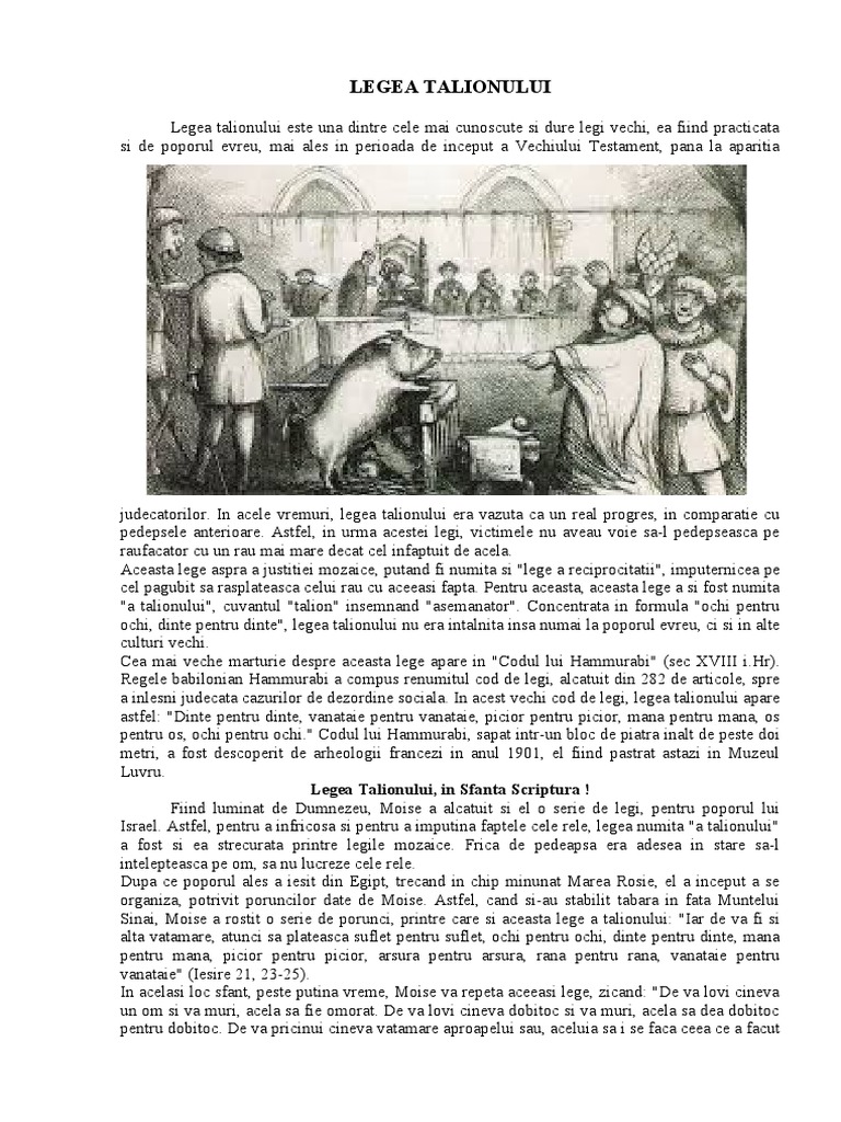 ochi, dinte pentru dinte", legea talionului nu era intalnita insa numai la poporul evreu, ci si in alte