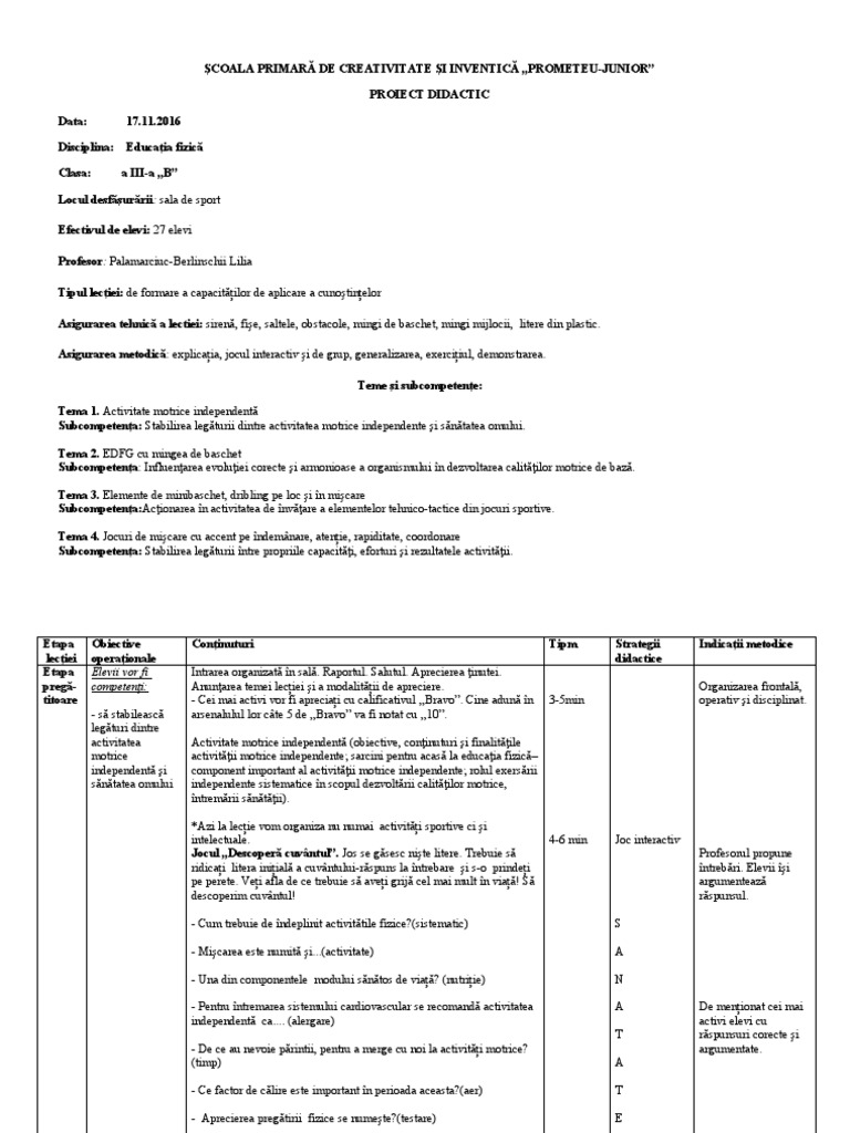 Subcompetența: Influenţarea evoluţiei corecte şi armonioase a organismului în dezvoltarea calităţilor motrice de bază.