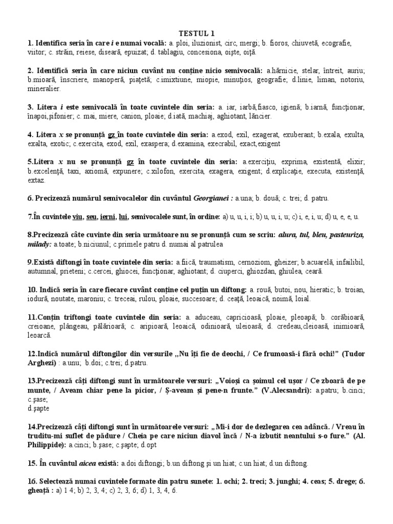 15. În cuvântul aicea există: [Link] diftongi; [Link] diftong şi un hiat; [Link] hiat; [Link] diftong.