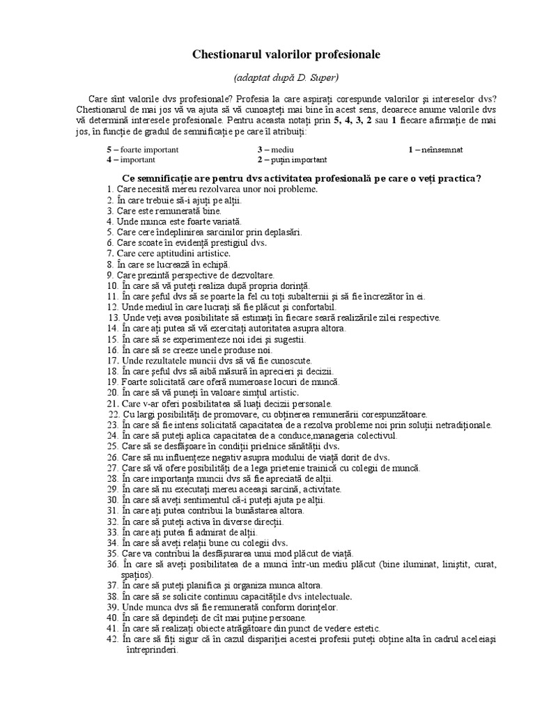 Chestionarul de mai jos vă va ajuta să vă cunoaşteţi mai bine în acest sens, deoarece anume valorile dvs