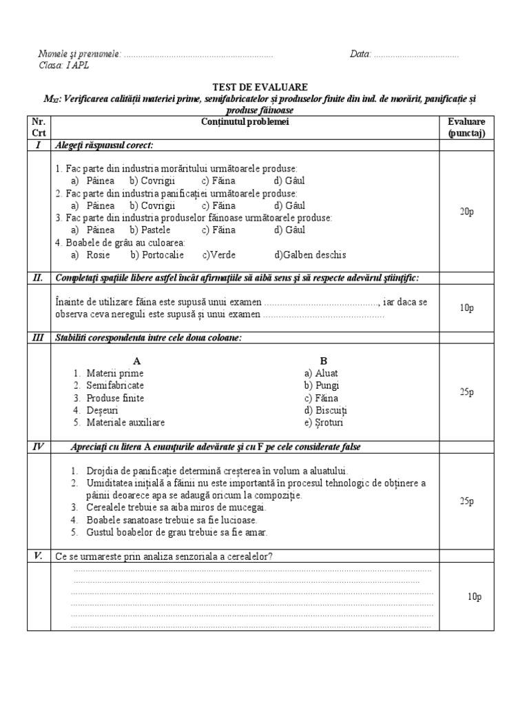 MXI: Verificarea calității materiei prime, semifabricatelor și produselor finite din ind. de morărit, panificație și