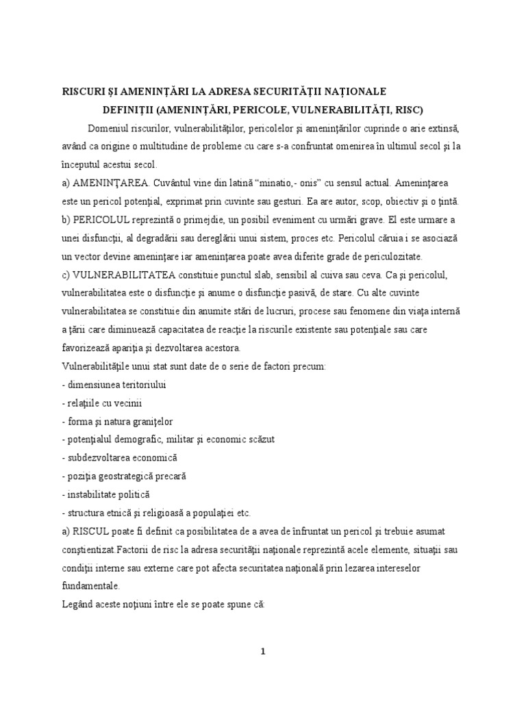 conş[Link] de risc la adresa securităţii naţionale reprezintă acele elemente, situaţii sau