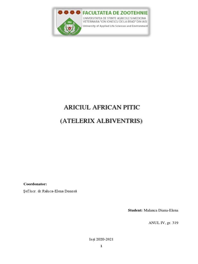PARTEA a II-a – ARICI AFRICAN ( ATELERIX ALBIVENTRIS)