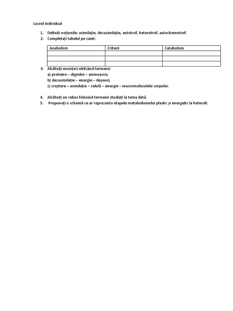 1. Definiţi noţiunile: asimilaţie, dezasimilaţie, autotrof, heterotrof, autochemotrof.