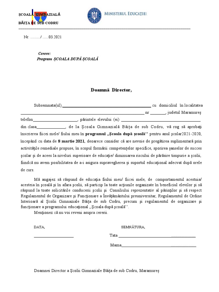 înscrierea fiicei mele/ fiului meu în programul ,,Şcoala după şcoală’’ pentru anul şcolar2021-2020,