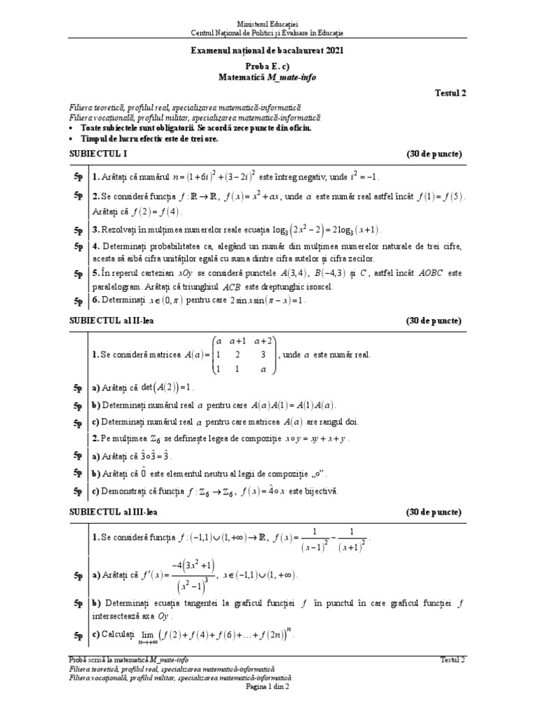 Probă scrisă la matematică M_mate-info Testul 2