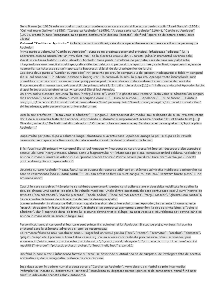 Lumea animalelor înfatisata de Gellu Naum capata trasaturi ale universului uman. Apolodor, în varianta lui umana, este