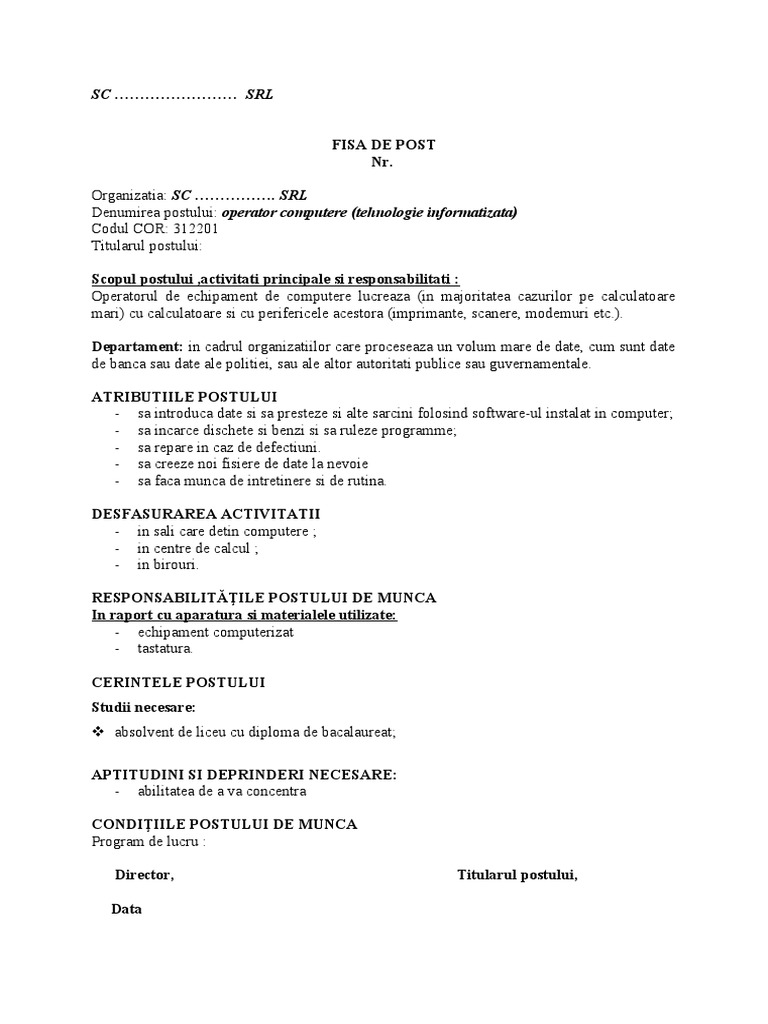 Denumirea postului: operator computere (tehnologie informatizata)