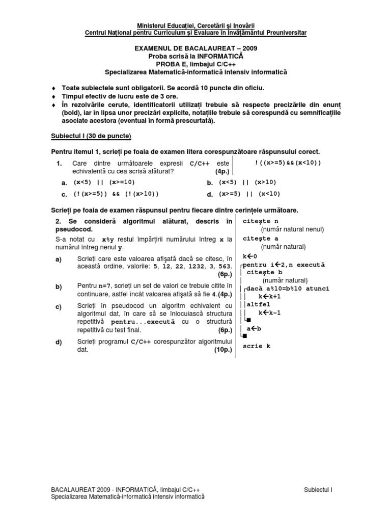 BACALAUREAT 2009 - INFORMATICĂ, limbajul C/C++ Subiectul I